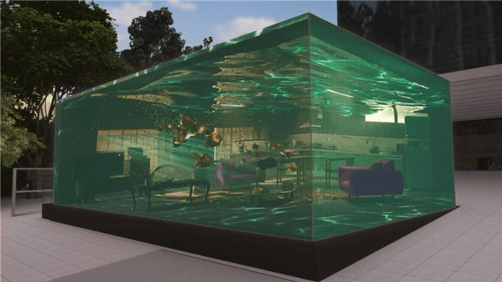 A instalação transporta essa metáfora para o espaço físico. Do lado externo, um painel de LED com perspectiva 3D cria a impressão de um ambiente doméstico sendo inundado, com móveis aparentemente submersos. O recurso visual busca gerar impacto imediato e atrair a interação do público.